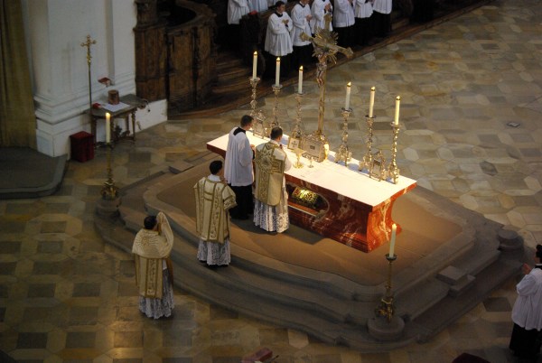 El pasado 8 de diciembre, solemnidad de la Inmaculada Concepción de la Virgen María, la comunidad del seminario de la Fraternidad Sacerdotal de San Pedro en Wigratzbad (Alemania), peregrinó a la abadía de Weingarten (o Württemberg), donde se ofició la solemne Santa Misa Tridentina, seguida de la bendición a fieles y seminaristas con la reliquia de la Preciosísima Sangre que allí se custodia. FSSP