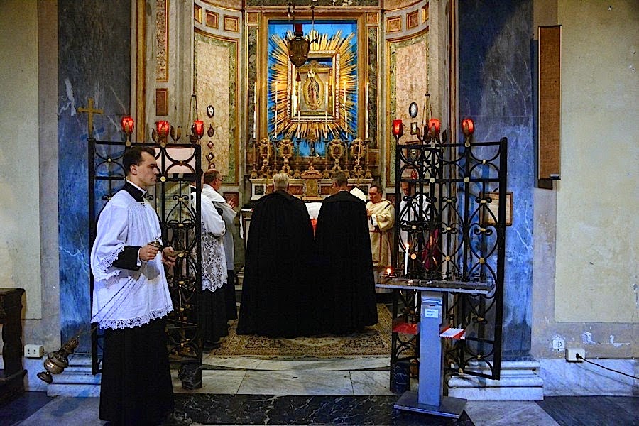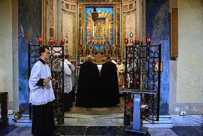 Sabato 10 Gennaio l'eminentissimo card. R. L. Burke, ha celebrato un solenne Pontificale al Faldistorio, nella splendida Basilica di San Nicola in carcere che è situata, nelle vicinanze del teatro Marcello in Roma. La dove un tempo la ferocia dei pagani, sacrificava agli idoli, oggi è accorso un gran numero di fedeli, per assistere al Santo Sacrificio della Messa,per contemplare con tenerezza ed amore Gesù che si dona ogni giorno. Ricordiamo che nella Basilica di San Nicola in carcere via del Teatro Marcello, 46, Roma la celebrazione della messa in latino è il Sabato alle ore 18:00 con la recita del Santo Rosario alle ore 17:40 curata dal gruppo stabile San Luigi Orione.